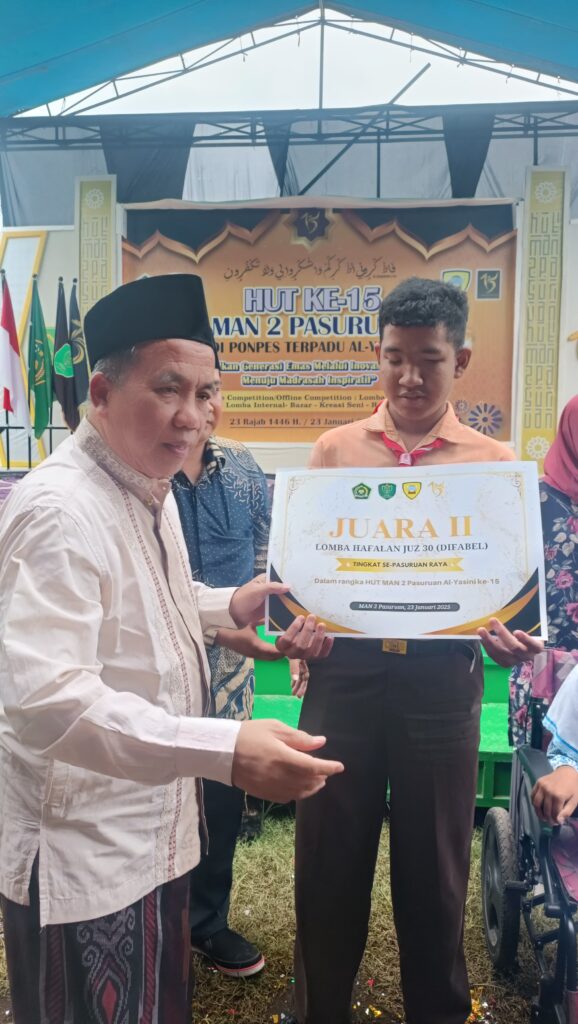 “Saya merasa terharu dan bangga melihat bagaimana MAN 2 Pasuruan tidak hanya unggul dalam bidang literasi tetapi juga memberi ruang bagi anak-anak berkebutuhan khusus. Madrasah ini benar-benar menjadi contoh teladan dalam membangun madrasah yang inklusif dan peduli terhadap semua kalangan,” ujar KH. Mujib. (https://www.dialogmasa.com/berusia-15-tahun-man-2-pasuruan-teguh-menjadi-madrasah-inklusi-peduli-dan-berprestasi/)