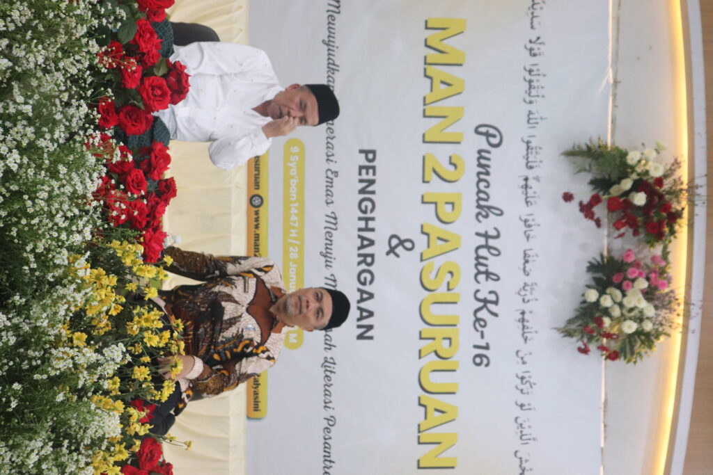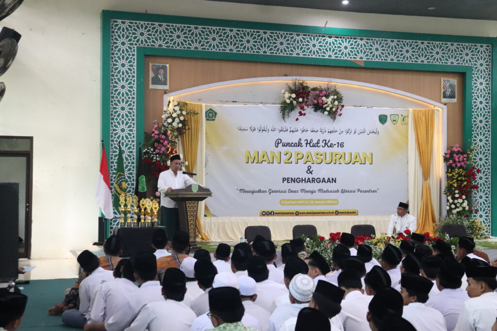 Peringatan puncak HUT ke-16 MAN 2 Pasuruan berlangsung meriah dan hidmat pada Rabu, 28/1/2026 di Gedung Al Yasini. Rangkaian mewarnai HUT sudah berlangsung beberapa hari sebelumnya yakni lomba Tahfidul Qur’an 5 juz tingkat SLTP se Jawa-bali, Lomba sholawat al banjari dan Expo produk unggulan siswa madrasah. Pemenang lomba tahfidul Qur’an